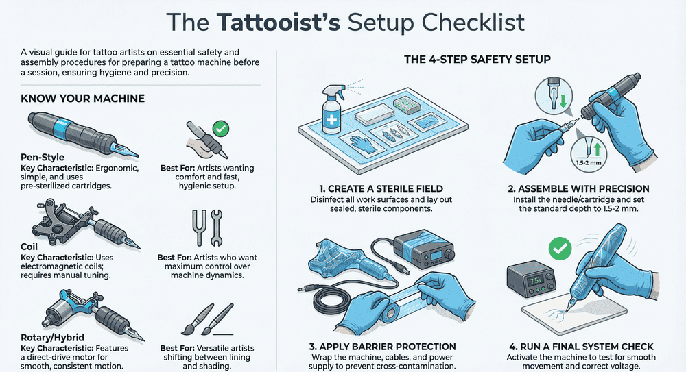 Properly preparing a tattoo machine is one of the most important steps in any tattooing session. It ensures your tools operate smoothly, your workspace stays hygienic, and your client receives a clean, consistent result. For apprentices and professionals alike, machine setup isn’t just routine—it’s a vital skill that directly affects your speed, accuracy, and safety.