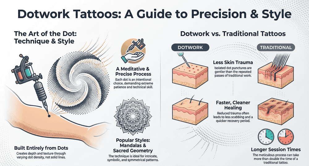 Finally, aftercare is simple but crucial. Keep the area clean, avoid sun exposure during healing, and resist scratching. Dotwork tattoos tend to heal faster with fewer complications, but only if treated with care. And remember: because the designs rely on contrast and clarity, preserving every dot counts.